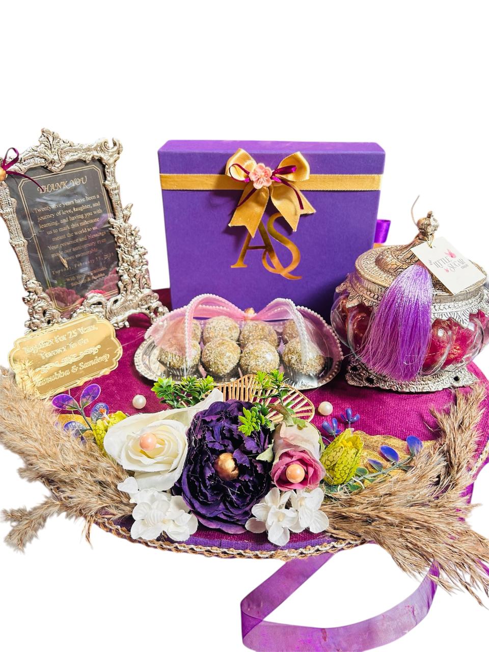 “Celebrate 25 years of togetherness with a beautifully curated anniversary hamper platter. Designed in elegant ivory tones with intricate textures and personalized detailing, this platter reflects timeless love, grace, and cherished memories.”