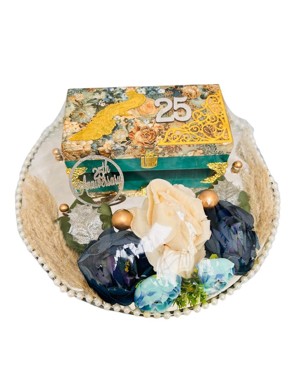 Celebrate 25 years of love and togetherness with this beautifully designed anniversary platter. Featuring a luxurious floral base, pearl detailing, and a stunning decorative box with golden accents, this platter is perfect for marking a timeless milestone with elegance.