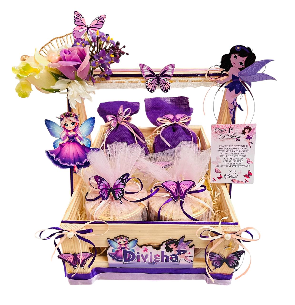 A magical fairy-themed return gift hamper for baby girl birthdays, beautifully curated with pastel décor, butterfly accents and personalized detailing — a perfect keepsake for little guests.