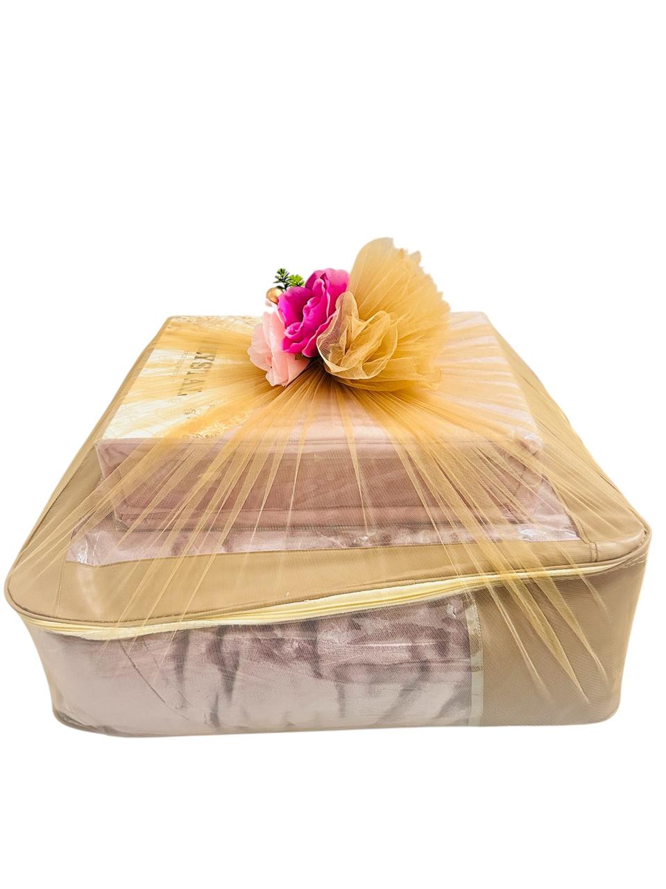 This luxury blanket trousseau packing is styled in soft golden net with floral detailing, making it a perfect symbol of comfort, blessings, and a beautiful new beginning for the bride.