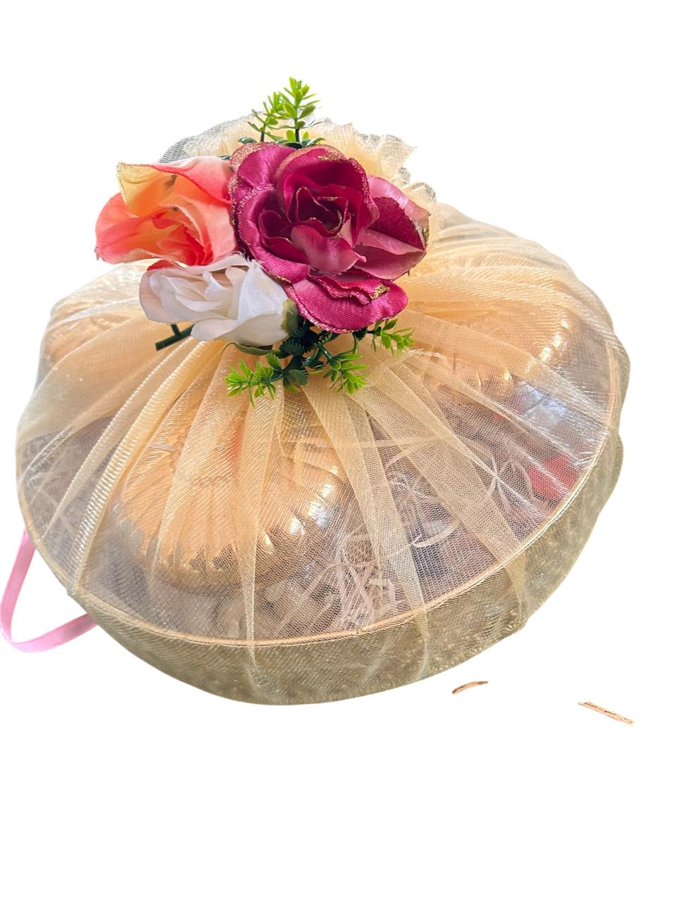 A luxurious metal dry fruit basket wrapped in soft golden net and adorned with delicate floral accents. Perfect for festive gifting and special occasions, it adds elegance and richness to every celebration.