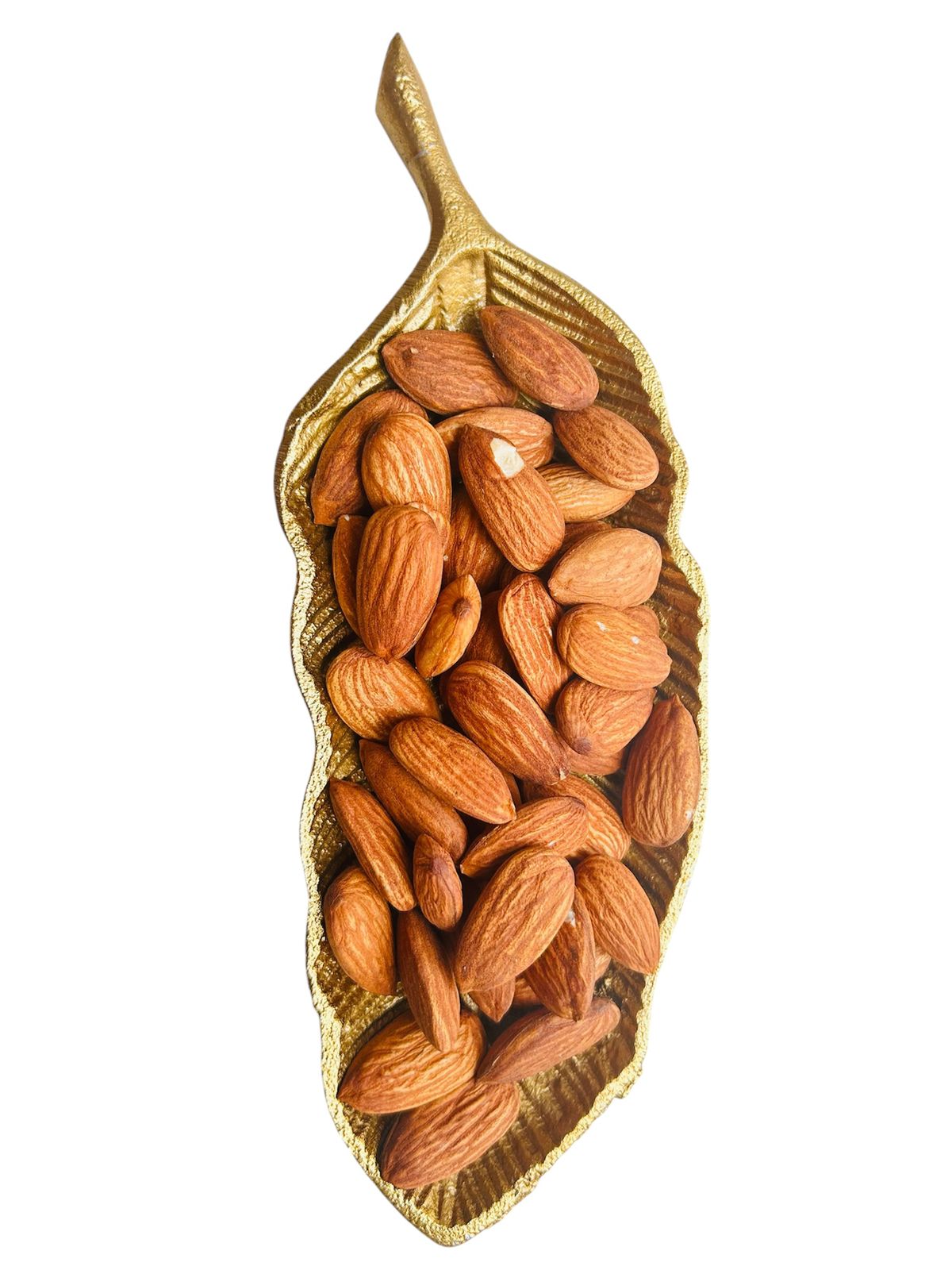 Golden Leaf Almond Tray – A symbol of luxury and purity. Handcrafted in a metallic golden leaf design and filled with handpicked almonds, this tray is perfect for creating unforgettable impressions in weddings, engagements, or festive hampers.