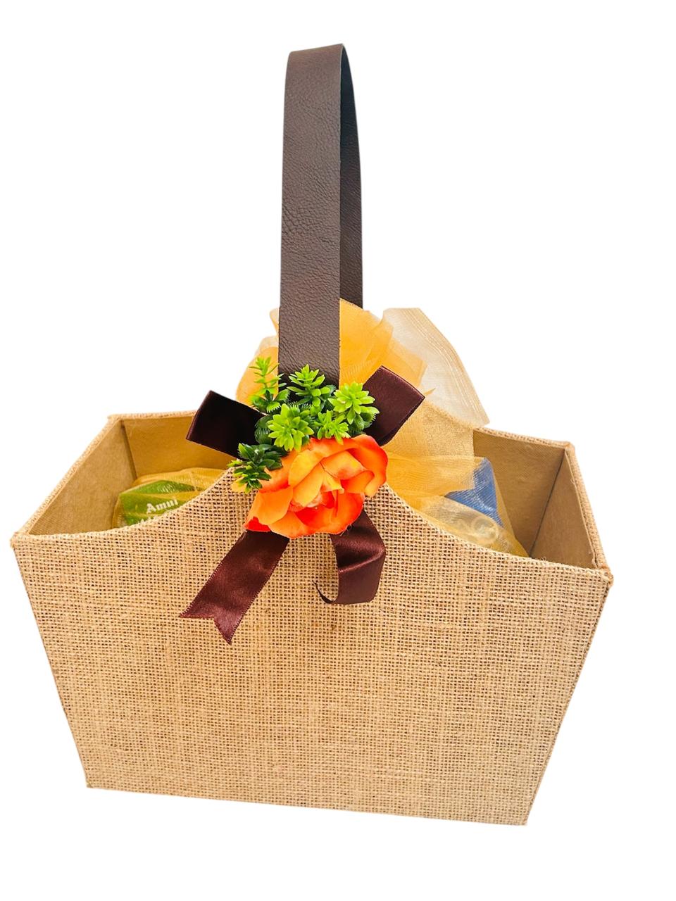 A beautifully handcrafted jute gift basket designed to add elegance to your gifting. 🌿