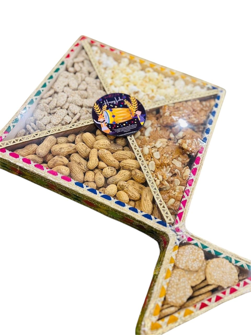 This beautifully crafted Lohri special kite-shaped hamper is filled with all the festive essentials – peanuts, popcorn, revdi, gajak & til sweets. A perfect blend of tradition and elegance, designed to make your Lohri celebrations warm, joyful & memorable. 🔥🪁