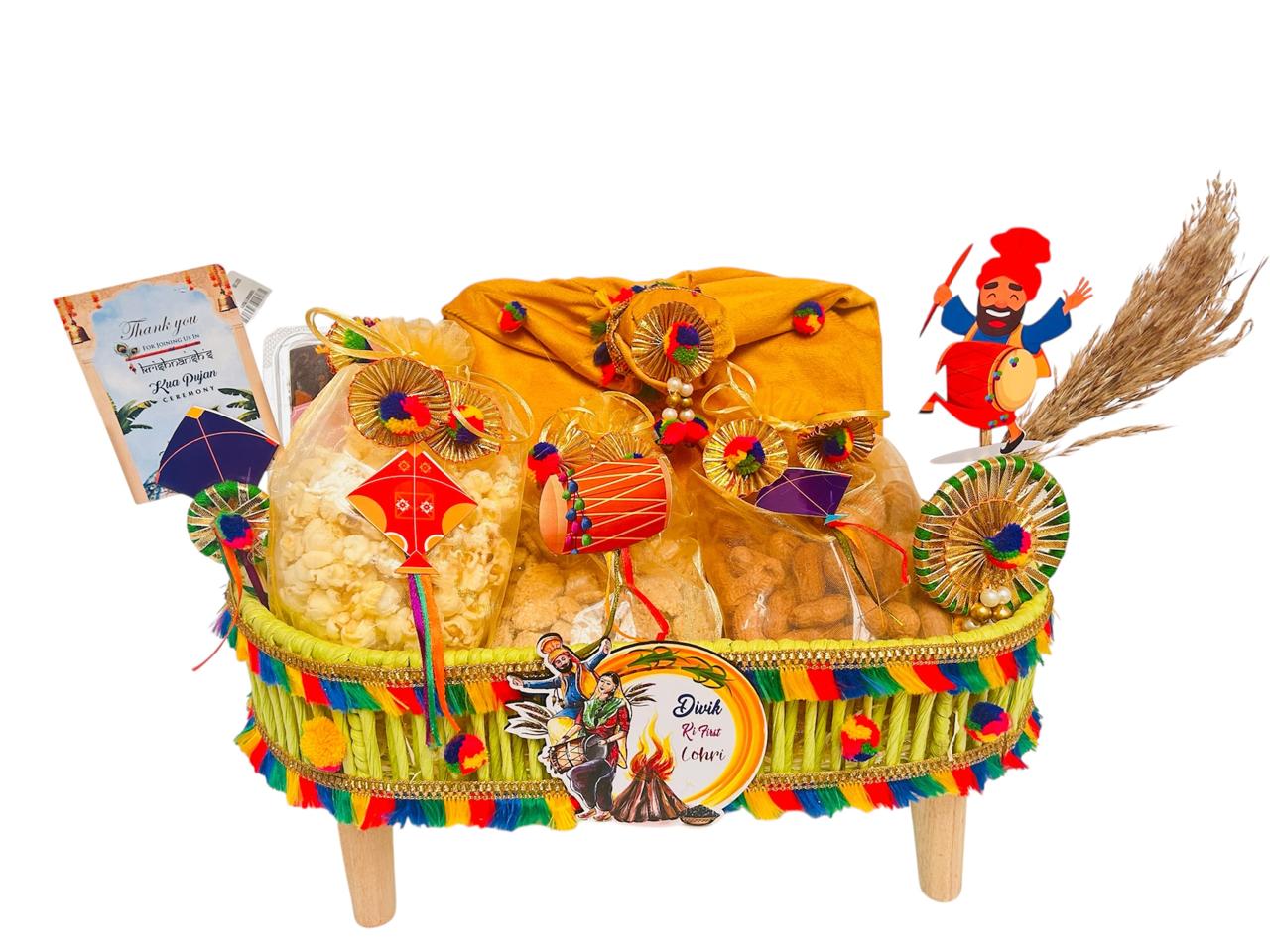 This handcrafted festive basket captures the true spirit of Makar Sankranti and Lohri, featuring traditional goodies presented in an elegant, colourful setup for auspicious gifting.