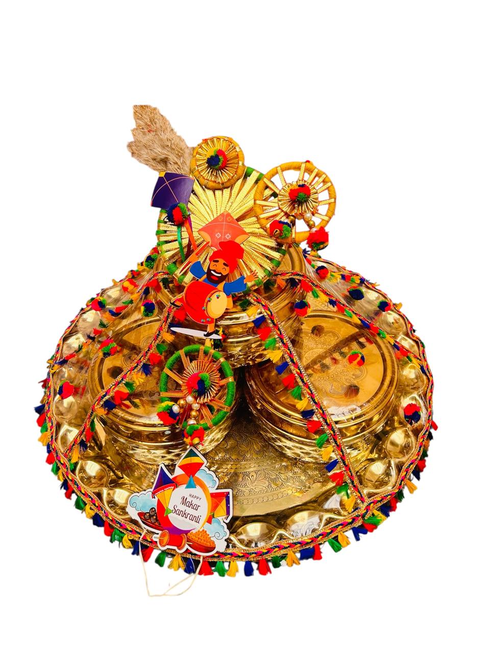 This handcrafted Makar Sankranti platter reflects the joy of the kite festival, featuring elegant golden containers and rich festive décor for auspicious gifting.