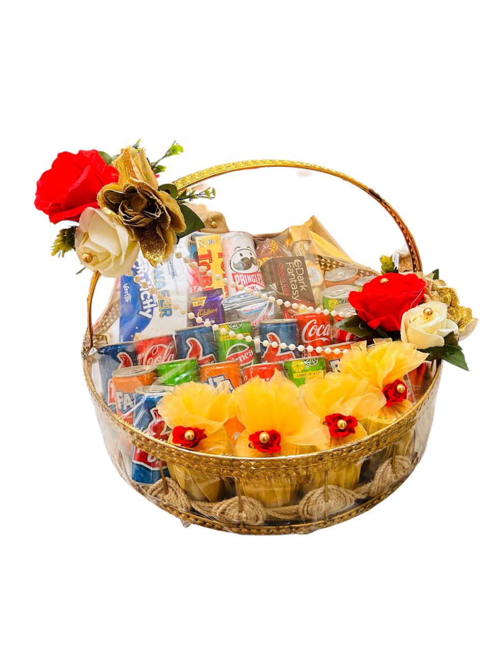 This beautifully curated snack hamper is packed with popular beverages, chips, chocolates, and munchies, all arranged in a classy transparent basket with elegant floral detailing.