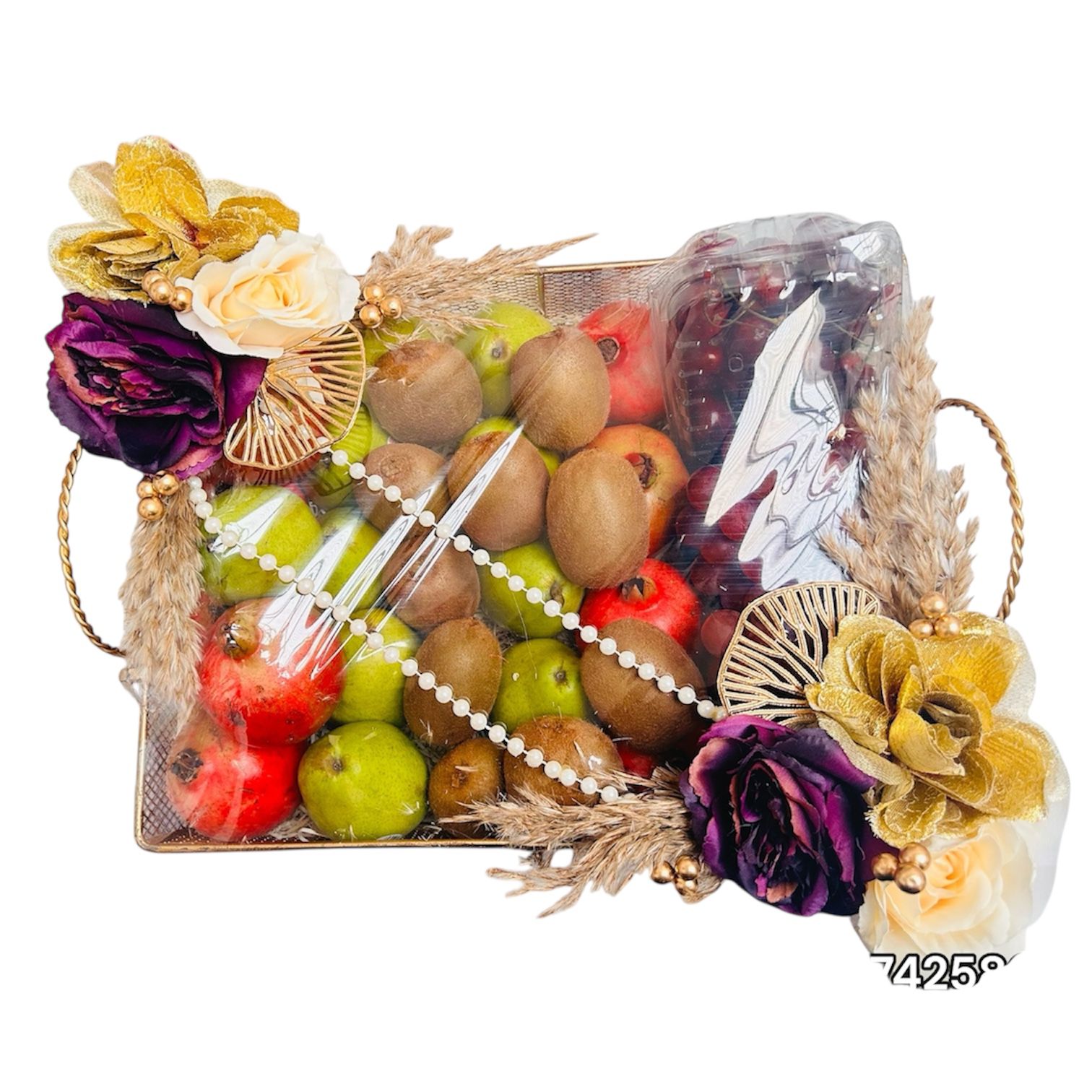 “A beautifully curated metal fruit basket filled with fresh fruits, styled with elegant florals and premium detailing ✨