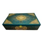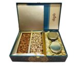 This is a beautiful invitation box. It is made up of MDF. It has golden U lock. The design comprises of multiple colors like navy blue, pastel golden. All are designed beautifully in theme. It has cavity and 2 jars in it. We can keep dry fruits in it. It has beautifully designed wedding cards having all the details of functions . The size of the box is 14’/9’/4′. This is a beautiful wedding invitation box for both bride and groom. It will give you a nice memory for both the families of bride & groom. This invitation box can be customized as well according to clients needs, requirements and budget.