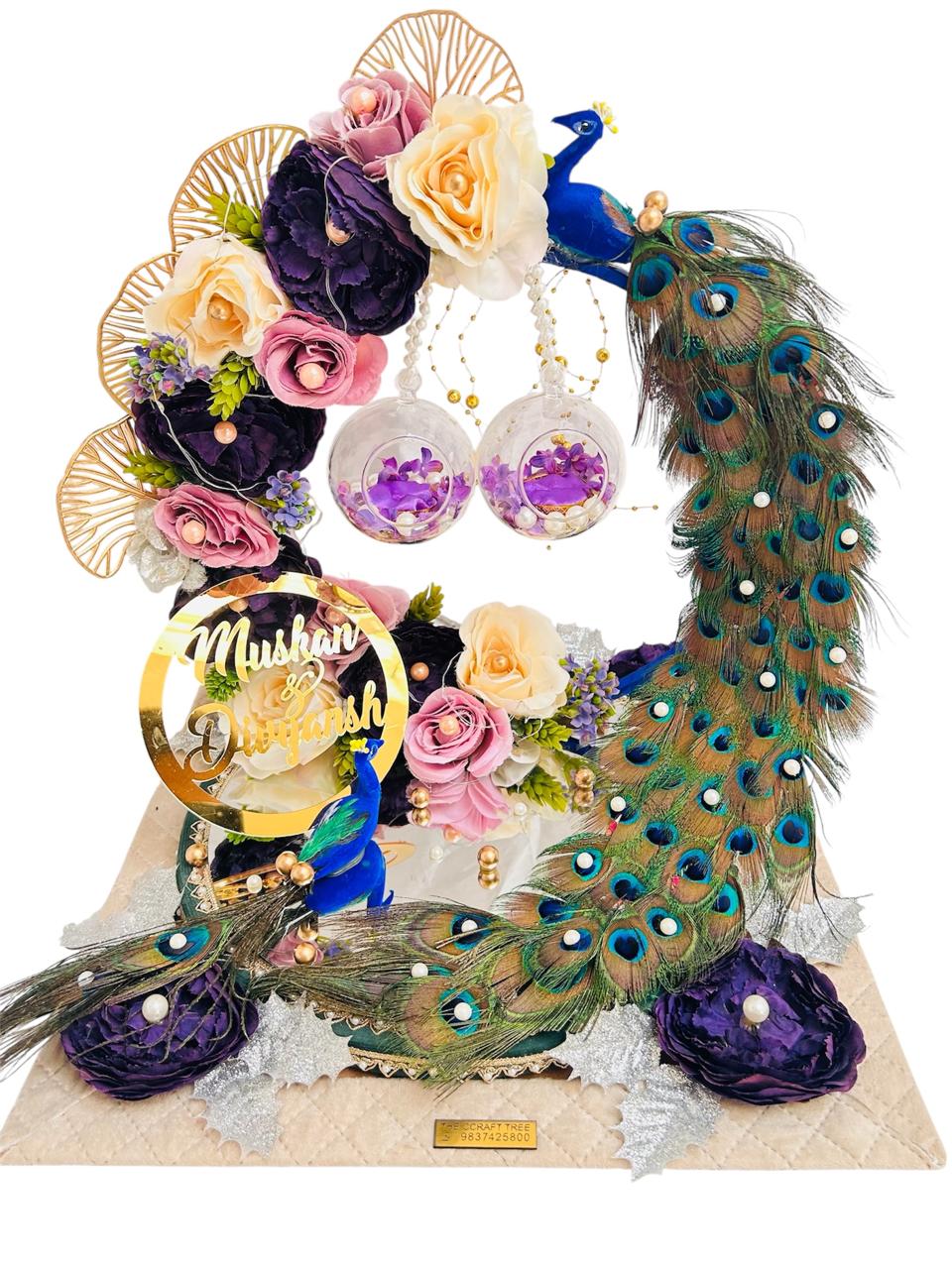 A statement ring platter handcrafted with premium MDF base, adorned with royal peacock detailing, real-look feathers, floral embellishments, pearls, and elegant hanging ring domes. Perfect for ring ceremony, engagement, roka, and wedding functions. Can be customized with couple names for a personalized touch.