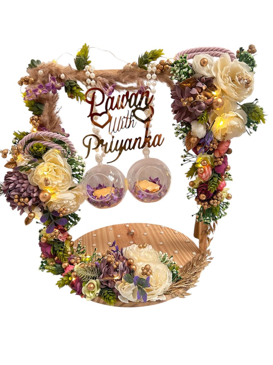 A beautifully handcrafted floral ring platter designed to make your special moment unforgettable. Adorned with delicate pastel blooms, pearl accents, and soft LED lights, this piece features personalized name detailing and hanging glass votives for a magical touch. Perfect for engagements, roka ceremonies, and wedding rituals.