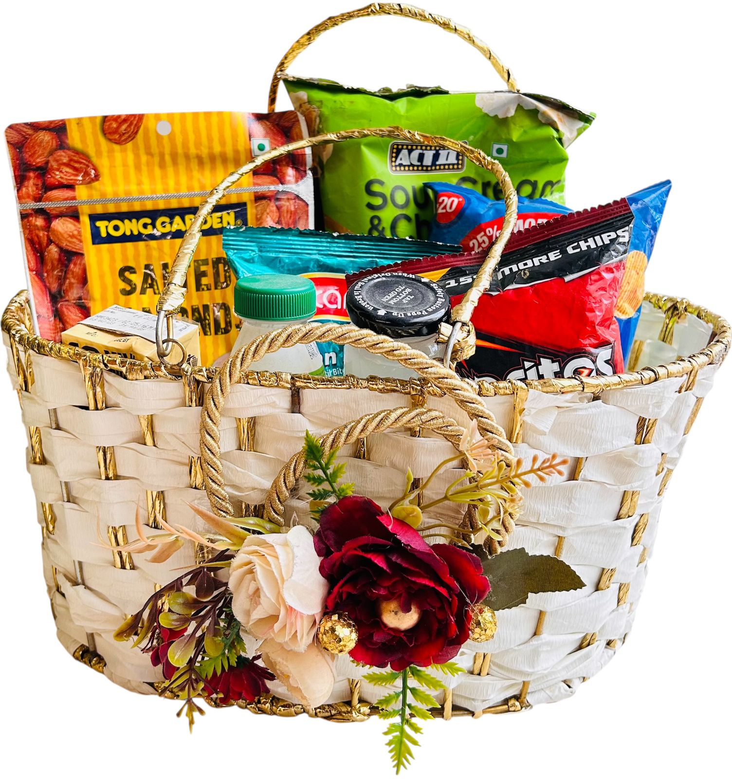 “A beautifully curated snack hamper arranged in a stylish woven basket with elegant floral detailing. Filled with delicious treats and goodies, this hamper is perfect for gifting on special occasions, celebrations, or as a thoughtful surprise. A perfect blend of style, taste, and happiness packed in one beautiful basket.” ✨🌸