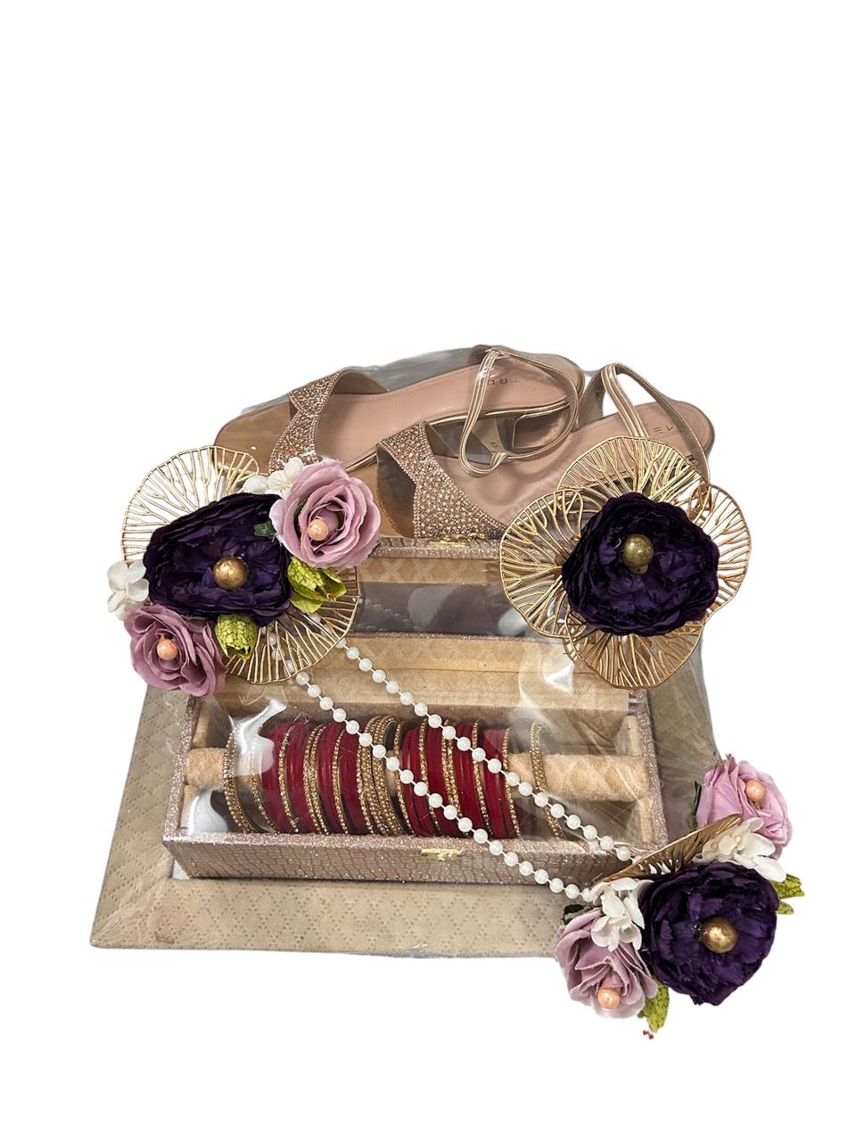 A beautifully curated bridal trousseau hamper featuring elegant bangles and stylish footwear, decorated with floral accents and premium detailing. Perfect for wedding gifting, roka ceremonies, and bride-to-be celebrations.