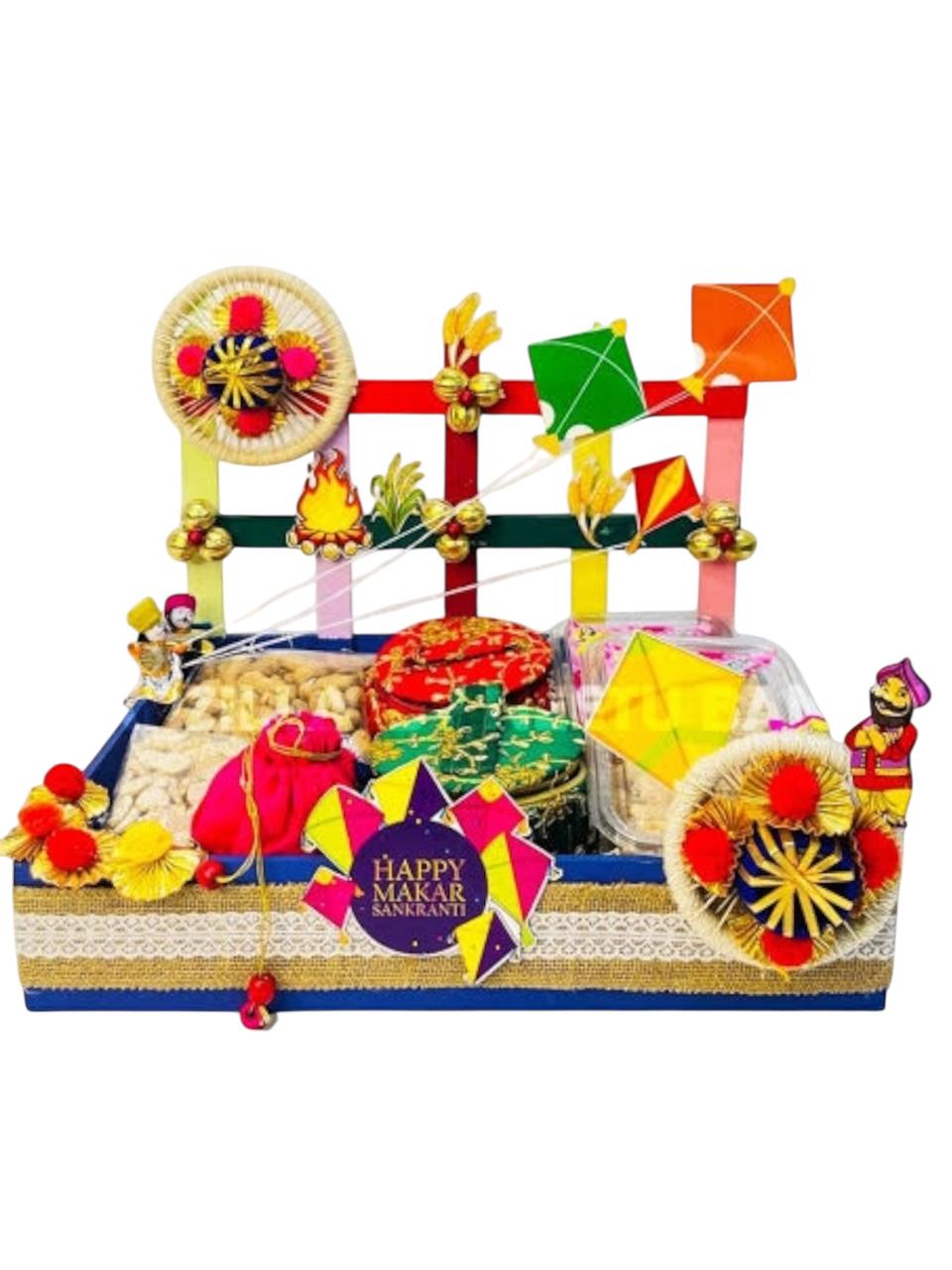 Adorned with vibrant kites, traditional elements, and festive treats, this hamper perfectly captures the warmth, colors, and spirit of the harvest festival.”