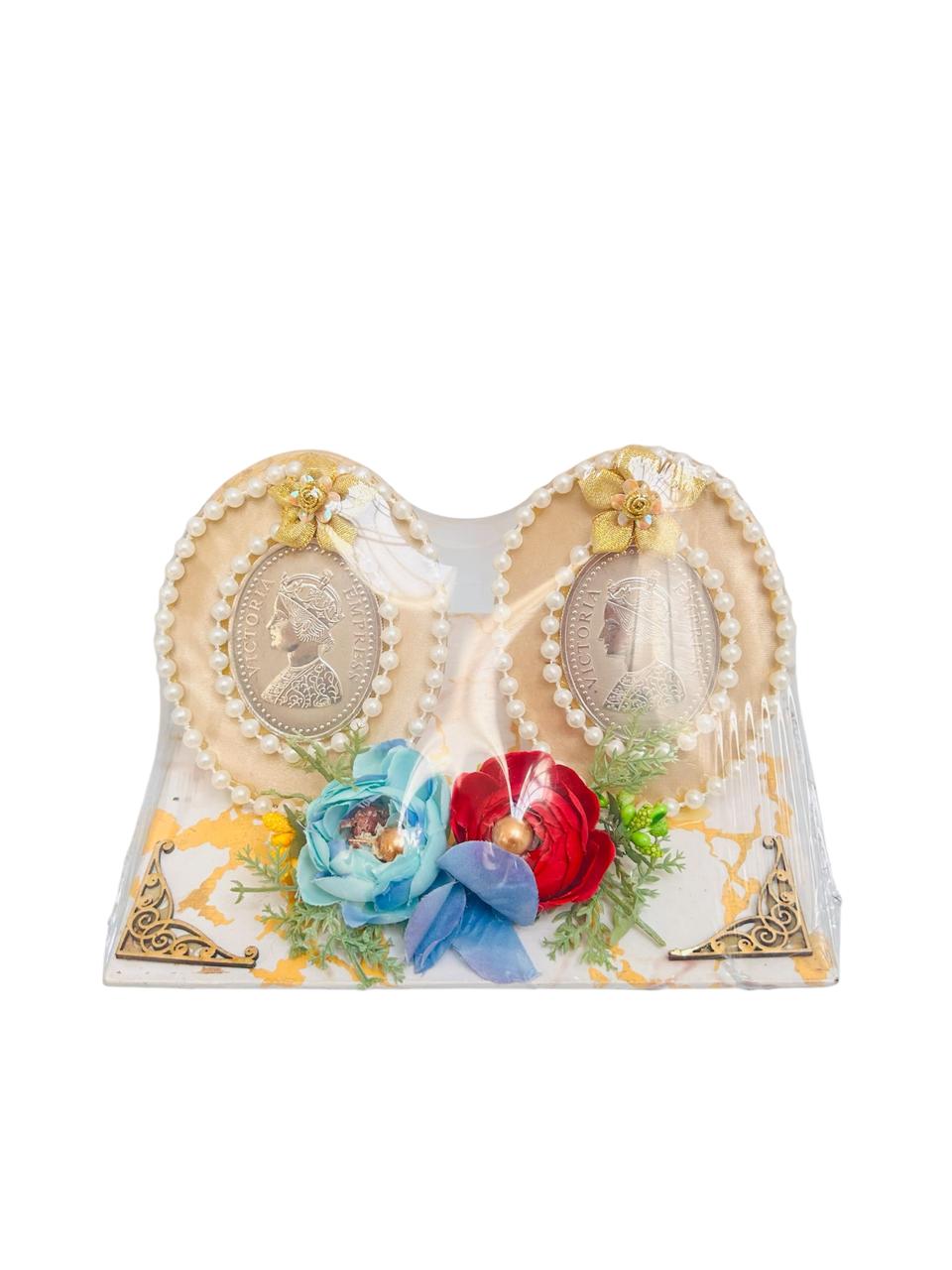 Beautifully handcrafted MDF tray adorned with pearl detailing, floral embellishments, and royal accents. Perfect for ring ceremony, trousseau packing, shagun, and wedding gifting. Adds a premium touch to your traditional presentations and makes your gifting look truly special.