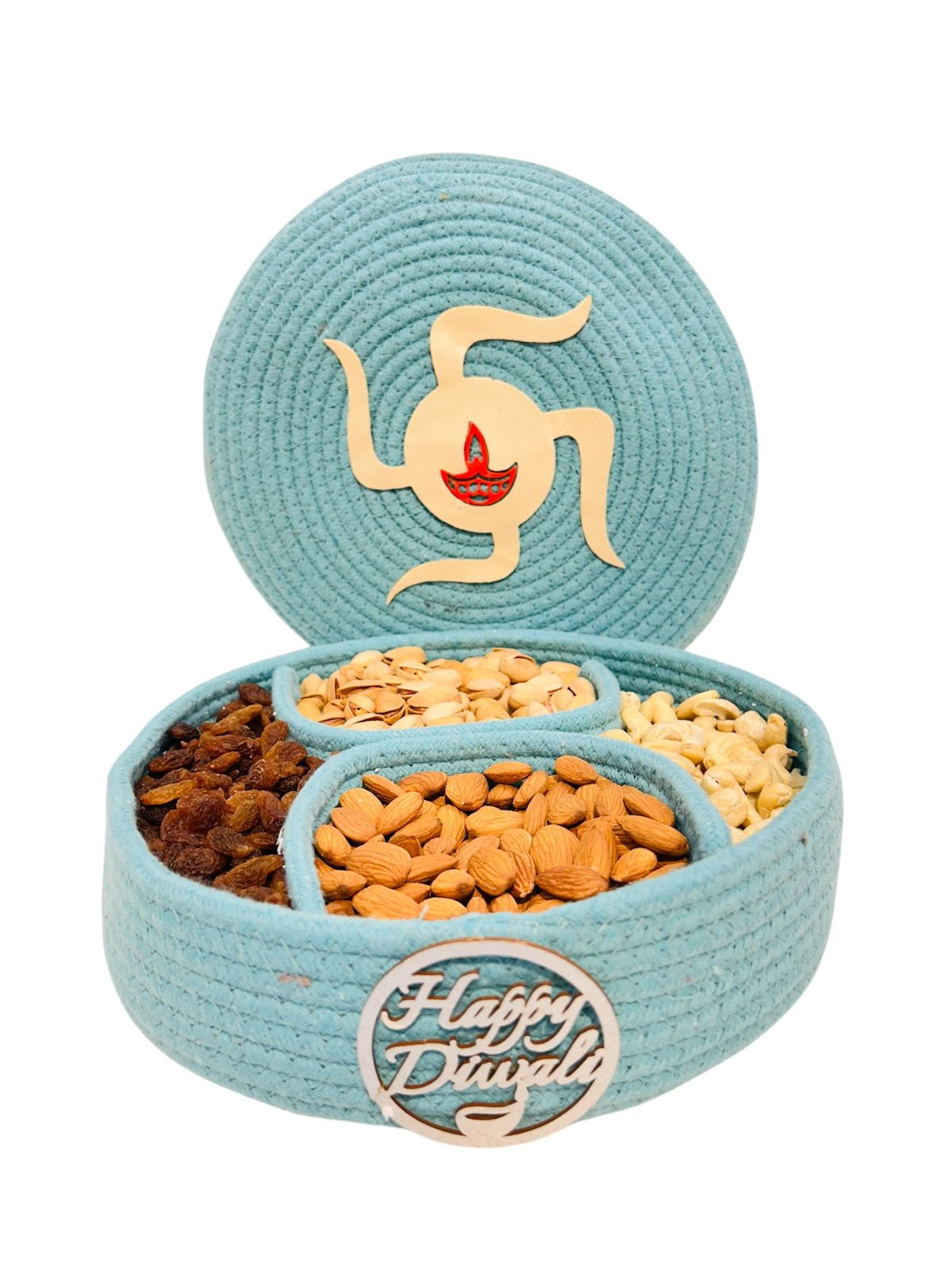 Celebrate the festival of lights with this beautifully handcrafted sky-blue basket featuring a swastik diya design on the lid and a festive Happy Diwali tag. The basket comes with 4 compartments filled with premium dry fruits — almonds, cashews, pistachios, and raisins — making it the perfect blend of taste, health, and tradition. A thoughtful gift for your loved ones, adding festive charm and prosperity to every celebration.