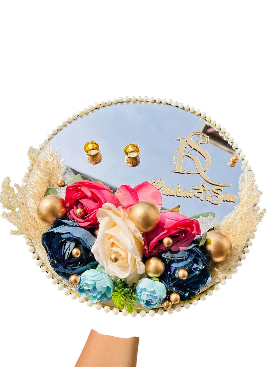 A perfect blend of elegance and personalization, this premium mirror ring platter is designed to make your special moments shine brighter. Adorned with a beautiful arrangement of vibrant roses, delicate dried elements, and luxurious golden accents, it creates a royal and eye-catching presentation. The customized name detailing adds a personal touch, making it ideal for engagements, weddings, and memorable ceremonies. Finished with pearl edging and paired with elegant tealight holders, this platter is not just décor—it’s a statement of love and celebration. ✨💍