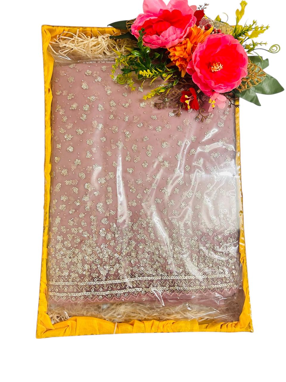 This designer saree packing tray is beautifully styled with soft florals and premium finishing, making it perfect for bridal trousseau, wedding gifting & special rituals.