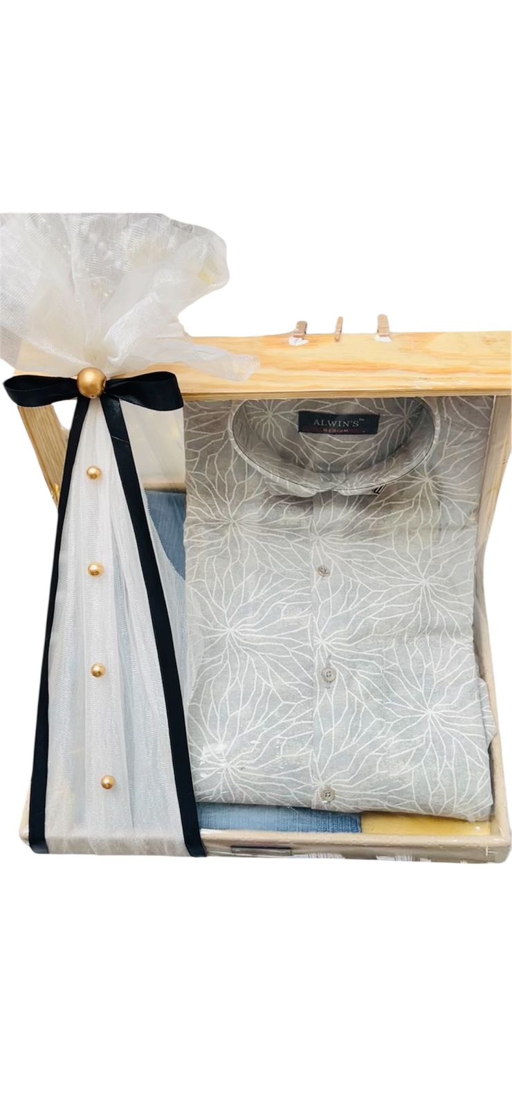 Soft neutral tones, neatly folded attire, and graceful detailing with sheer fabric, pearl accents, and a classic bow—perfectly curated for wedding gifting with understated luxury.