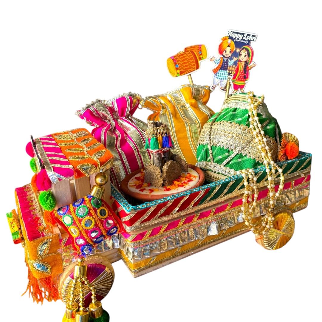Traditional Punjabi theme ke saath hand-crafted designer box, vibrant colours, gota detailing aur festive elements ke saath ek perfect Lohri presentation.”