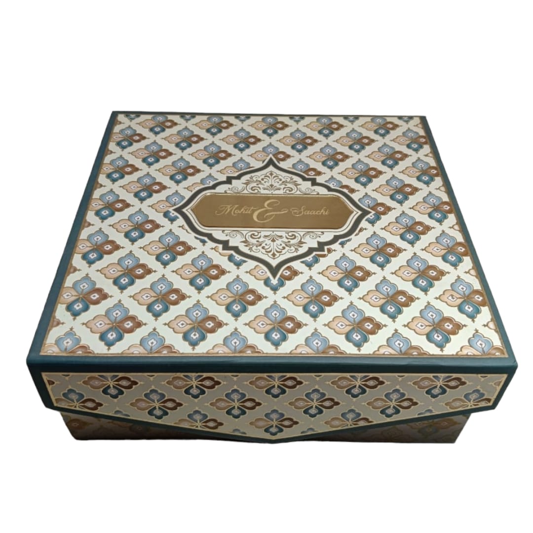 This is a beautiful invitation box. It is made up of cardboard. It has flap style box. It has golden acrylic plate in the middle of the box. The design comprises of multiple colors like grey, blue, brown . All are designed beautifully in theme. It has 2 jars and cavity in it. We can keep dry fruits in it. It has beautifully designed wedding cards having all the details of functions . The size of the box is 11.5’/11.5’/3.5′. This is a beautiful wedding invitation box for both bride and groom. It will give you a nice memory for both the families of bride & groom. This invitation box can be customized as well according to clients needs, requirements and budget.