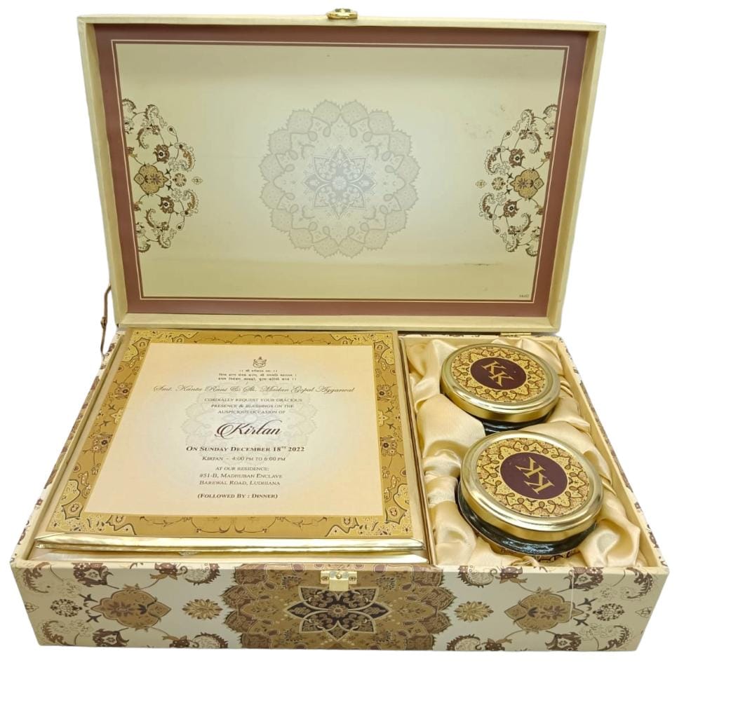This is a beautiful invitation box. It is made up of MDF. It has golden U lock. The design comprises of multiple colors like yellow, golden. All are designed beautifully in theme. It has two jars in it . It has cavity in it. We can keep dry fruits in it. It has beautifully designed wedding cards having all the details of functions . The size of the box is 19’/9’/4”. This is a beautiful wedding invitation box for both bride and groom. It will give you a nice memory for both the families of bride & groom. This invitation box can be customized as well according to clients needs, requirements and budget.