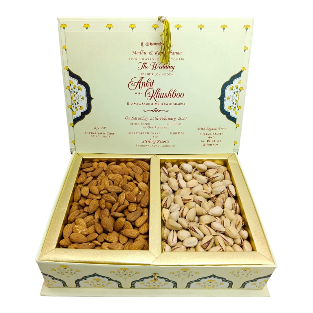 This is a beautiful lemon yellow mughal print invitation box. It is made up of cardboard. It is a flap style box. The design comprises of multiple colors like green, red, pink. All are designed beautifully in theme. It has cavity in it. We can keep dry fruits in it. It has beautifully designed wedding cards having all the details of functions . The size of the box is 11.5’/8.2’/2.5′. This is a beautiful wedding invitation box for both bride and groom. It will give you a nice memory for both the families of bride & groom. This invitation box can be customized as well according to clients needs, requirements and budget.